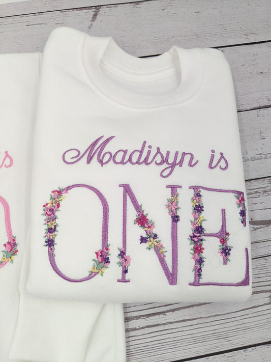 Children Personalised 1st Birthday Sweatshirt with Monogram Floral Font- Embroidery