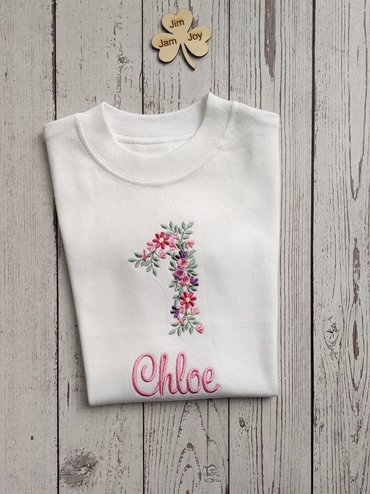 Children Personalised 1st Birthday Tshirt with Monogram Floral Font- Embroidery