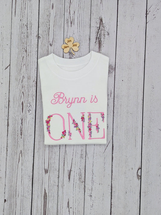 Children Personalised 1st Birthday Tshirt with Is One Floral Monogram - Embroidery