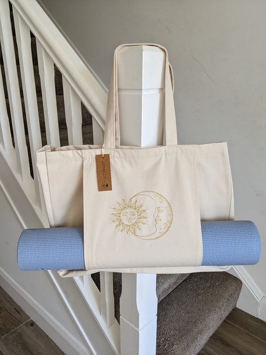 Personalised Yoga Tote Bag Moon and Sun , Yoga Mat Bag, Yoga Mat Pocket, Pilates Mat Bag, Organic Cotton Tote - Embroidery